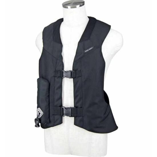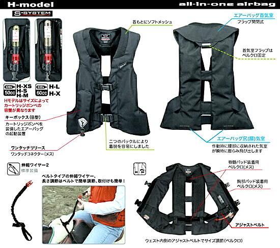ヒットエアー(衝撃保護システム)付きジャケットは乗馬の際に上衣として着用し、アクシデントにより馬から一定の距離離れた瞬間に、キーボールが抜け、ヒットエアーに組み込まれたキーボックスが作動してカートリッジボンベより炭酸ガスが各気室に送り込まれ、瞬間的に膨張する仕組みとなっています。