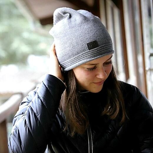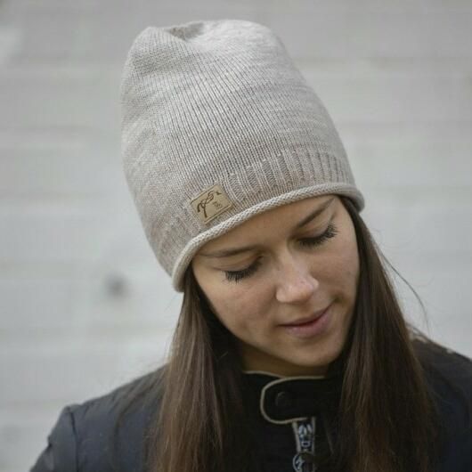 フェイクレザーのロゴ入りのニット帽です。ワンサイズ。100%アクリル。