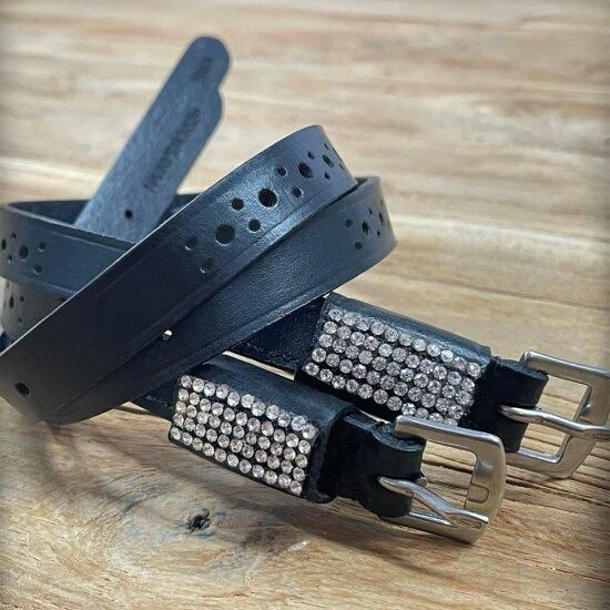 クリスタル装飾と穴飾りが施された革の拍車ベルトです。