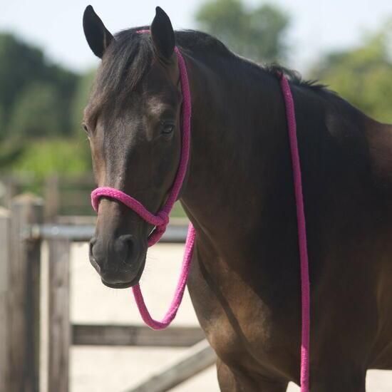このリード無口は太いロープ1本で構成されており、どんな馬にもフィットするように調整可能です。ロープをスライドさせることで調整可能です。手綱を使った調教や、サイズの異なる複数の馬に簡単に使用できます。