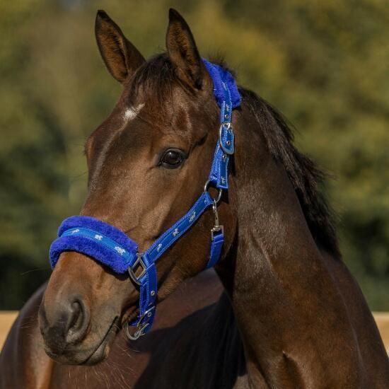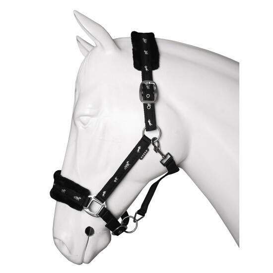 鼻革とヘッドピースに柔らかなファーの裏地が付いた、馬柄模様の可愛い無口です。